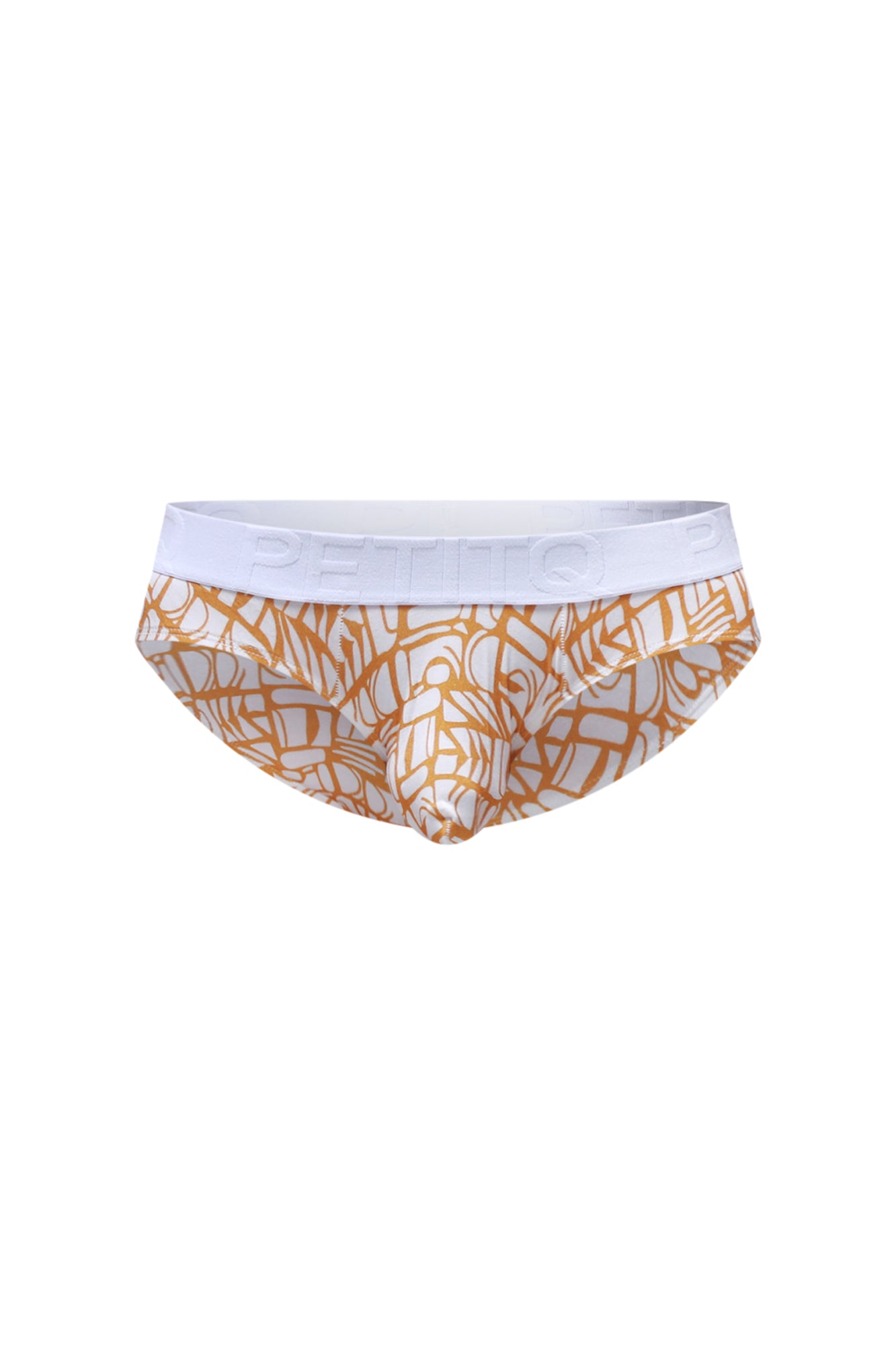 The Brief Chill Carlot Alloy is a low-rise men’s brief made from lightweight modal (95% modal, 5% spandex), featuring a bold white and orange geometric print and a soft white waistband for contrast.