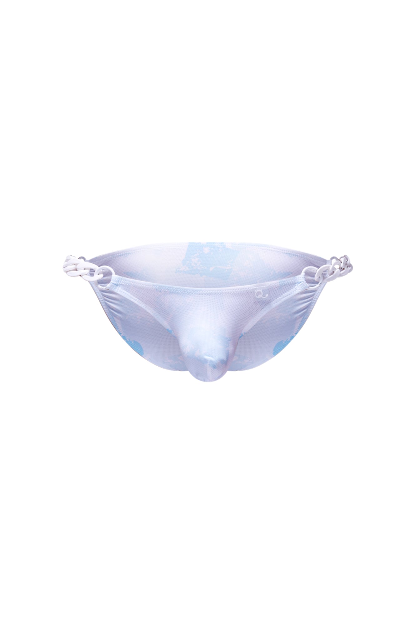 The Chains Marbre Sky Blue bikini is a low-rise men’s brief designed to stand out with its unique details and soft color palette. Made from smooth stretch swimwear fabric (82% nylon, 18% spandex), it features a white base with soft sky-blue marble-style patterns and decorative white plastic side chains for a bold, graphic touch.