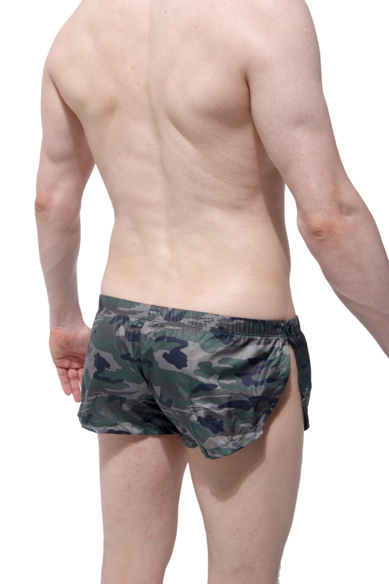 Sexy pantalón corto de hombre en tejido de camuflaje muy ligero con solo un broche en ambos lados para desvestirte en segundos. Ahora disponible en varios colores